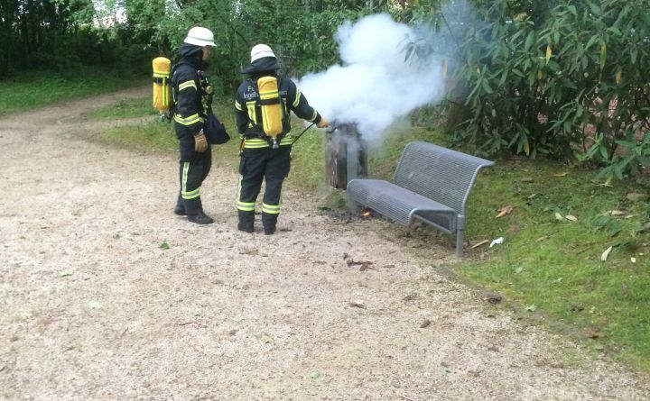Auf einem Spielplatz wurde ein Müllbehälter vorsätzlich in Brand gesteckt.